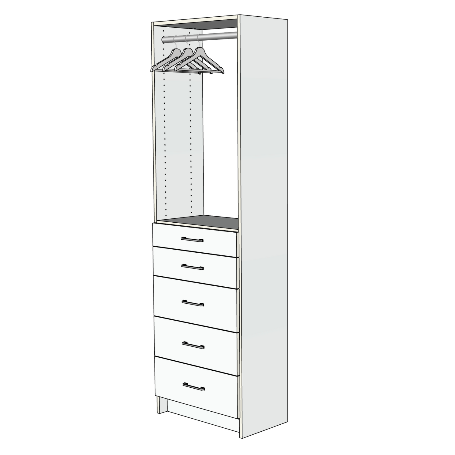 Our Custom Closet 5 Drawers with Upper Hanging Rod unit is made to order as a floor standing unit with toe kicks for a truly custom look.